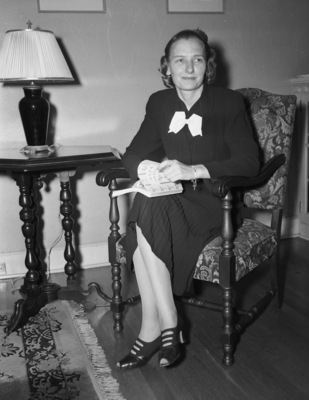 Miss Alliene Harder of New York, New York. is spending three weeks visiting her parents, Mr. and Mrs. Henry Charles Harder. Miss Harder is sitting in an armchair, reading a book. She is wearing a pleated dress with a bow on the front. Beside the chair is an end table and a lamp. After Miss Harder visits her parents, she is planning a trip to Oklahoma. Published in Fort Worth Star-Telegram, morning edition, October 6, 1940.