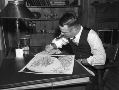R. L. "Dutch" Meyer is the head football coach at Texas Christian University. In 1938 he led the Horned Frogs to a National Championship. He is demonstrating his off-season routine, which still involves football. Coach Meyer is sitting at his desk busily engaged writing in a notebook. He is smoking a pipe and dressed in a three-piece suit without the jacket. There is TCU memorabilia spaced around his office. Published in the Fort Worth Star-Telegram, February 11, 1940.