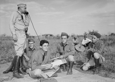 Texas National Guard maneuvers in Louisiana. When Battery F, One Hundred and Thirty-first Field Artillery, Texas National Guard, received the commander's order to open fire at range practice. Here, Second Lieutenant J. E. Garrison, at the field telephone, receives the range data and passes it on to his gun crews. His aids are, left to right, Private John C. Hensley, Corporal Leon Sparkman, and Private Sherrill. Each of the aids is from Jacksboro, Texas, seen sitting on blankets in the grass.