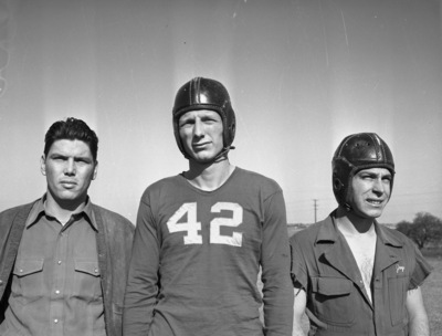 The Texas Wesleyan Rams have been plagued with injuries to start the season. One of their starting backs is out with a knee injury and Coach Miller is looking for someone to fill in. Two of the players who will play a role in the backfield are W. H. Ledbetter (center) and Jay Lowery (right). Ledbetter (42) will get the start in the backfield at fullback. Ledbetter is a converted guard and will fill in where necessary. Published Star-Telegram Eve. Nov. 14, 1941.