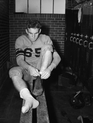 The Polytechnic Parrots are preparing for their important game against the rival Paschal Panthers. Bayne Anderson is being featured in a locker room close-up. He is one of the star blocking backs for the Parrots and weighs in at 165 pounds. Along with a tough line, Bayne has contributed to a revived offense. He is sitting on a bench in the locker room, lacing his cleats. He is dressed in his number 65 football uniform.