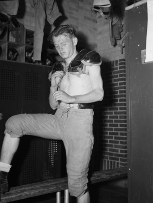 Brown, Gordon; Polytechnic High schools; Polytechnic Parrots; Football; Football players; Shoulder pads; Football Uniforms; Locker rooms; Lockers