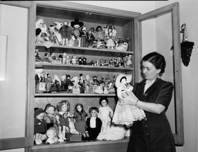 Mrs. Julian S. Leach is a collector of antique dolls. Her shelves are filled with American history, as each doll is a representative of the states, sections, and eras of America. Mrs. Leach is holding one member of the collection - a Civil War era doll dressed in a Scarlett O'Hara costume. Mrs. Leach is wearing a button-up dress.