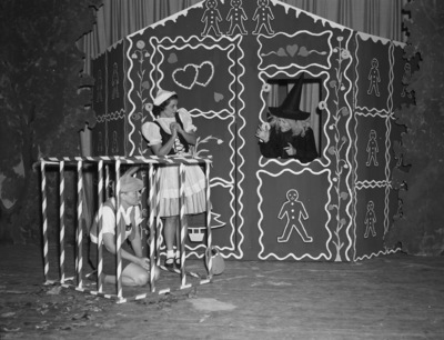 The Junior League Theater Group is taking plays to Fort Worth elementary schools for their eighth annual season. Eugene Woodfin directed the production of Hansel and Gretel. In the candy cane cage is "Hansel" played by Mrs. G. R. Thomas. Miss Mary Ellen Lilly, "Gretel", is standing outside the house. Peaking through the window of the ginger bread house is Mrs. Tom Prettyman dressed as a witch. Published in the Fort Worth Star-Telegram morning edition, October 27, 1940.