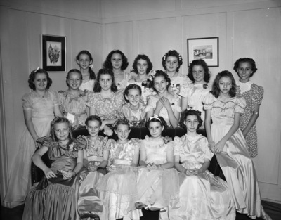 Members of Aowakiya Camp Fire Group are left to right, front row - Ellaveen Childress, Joanne Dossett, May Lively. Mary Jane Mersfelder and Jane Barfield. Center row, Mary Helen Oneil, Mina Seipel, Carolyn O'Gara, Treva Ann Mead, Marjorie Mitchell and Ann Graham. Back row, Barbara Straighton, Joanne Olmsted, Ann Davis, Ruth Wilson, Gwendolyn Kline and Patricia Tucker. The girls are attending a formal dinner party at the home of Mrs. L. C. Mersfelder. They are all dressed in long gowns. Mrs. J. C. Davis is the group guardian and Joanne Dossett is the president of the club.