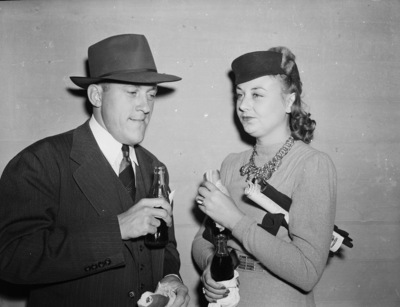 By airplane and ambulance sports fans converged on Texas Christian University Stadium to witness the inaugural Southwest Conference game between the Horned Frogs of Texas Christian University (TCU) vs. University of Arkansas. pictured here are spectators George Farrell, Albany, Texas and Miss Neva Bradford getting refreshments during halftime. Mr. Farrell is wearing a suit, tie, and hat, while Miss Bradford is wearing a dress, necklace, and hat. They are both holding a hot dog in their left hands and a soda in their right. Miss Bradford is also holding a rolled up paper under her left arm. Star-Telegram Morning, October 6 1940.