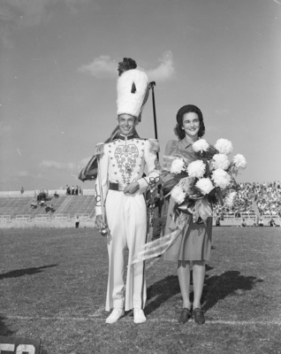 By airplane and ambulance sports fans converged on Texas Christian University Stadium to witness the inaugural Southwest Conference game between the Horned Frogs of Texas Christian University (TCU) vs. University of Arkansas football game spectators. Band sweetheart for the day wasJean Montgomery, Sweetwater, Texas, who is being escorted by Tom Barber, drum major. Montgomery is wearing a dress and a hat and carrying a very large bouquet that was provided by band director Don Gillis. Barber is wearing his uniform, which includes an embroidered shirt, a large belt, and a very large hat; he is also carrying a baton. The two of them are standing on the football field with a crowd of people in the stands in the background behind them. Star-Telegram Morning, October 6 1940.