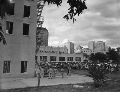 Fire drill at the Fort Worth central fire station during Fire Prevention Week. A large crowd is gathered to watch firefighters demonstrate fire safety. Buildings in downtown Fort Worth feature prominently in the background.