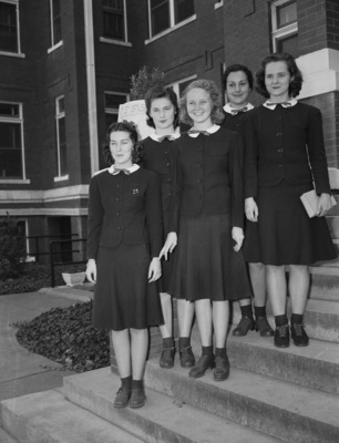 The senior class of Our Lady of Victory Academy officers are (left to right) Misses Margie Sullivan, reporter; Eileen Powell, treasurer; Janice Askew, secretary; Mary Florence True, vice president and Patricia Donoghue, president. Miss Donaghue has been president of the class of 1941 since the first year high school. All the ladies are wearing the school uniform of coat and skirt with white collar and a ribbon around the white collar. They are standing on the building steps. Published in the Fort Worth Star-Telegram morning edition, November 3, 1940.