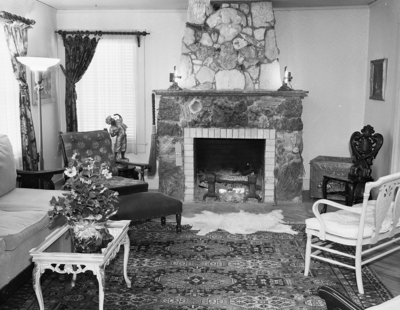 Image shows Mrs. F. L. Motheral family's home on their 80-acre farm near Rendon, Texas. On the mantel above the fireplace are two figurines. Beside the fireplace, left, is a statue. Also in the living room are several chairs and an animal fur rug. The Motheral home is an example of urban comfort in a rural setting which has attracted many city dwellers. Published in the Fort Worth Star-Telegram evening edition, January 29, 1940.