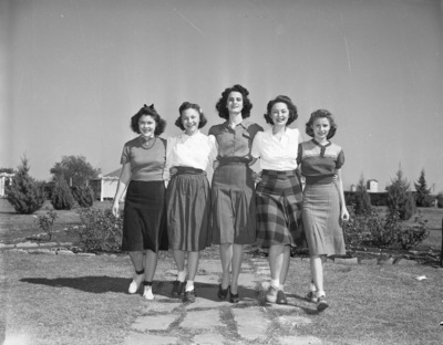 Our Lady of Victory College (OLVC) Student Council is pictured here. From left to right, are Miss Jane Weaver, Fort Worth, Texas; Miss Nellie Ann Riefler, Dallas, Texas; Miss Theresa Wade, Marlow, Oklahoma; Miss Mary Ann Dunham, Fort Worth, Texas; and Miss Mary Elizabeth Greer, Fort Worth, Texas. All five ladies are wearing knee skirts and blouses and shoes.