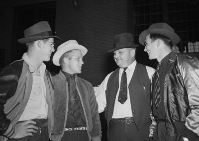 Texas Christian University football players leaving for North Carolina. Left to right are Kyle Gillespie and Dean Bagley, Harmon Hightower's father and Harmon Hightower.. All of them are seen to be wearing jackets, pants, and hats with only Gillespie not wearing a tie. They are standing in front of a brick structure with large windows. Star-Telegram Morning, October 10 1940.