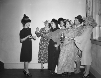 This Comedy Cast Will Present 'Gossip' -- Cast for a one-act comedy, "Gossip", to be presented by the B. H. Carroll School Parent-Teacher Association (P. T. A) at 7:45 p.m. Friday at the McLean Junior High School auditorium along with six other entertainment numbers. The play cast is pictured here. Seven actresses, from left to right, are Mrs. Doyle Gregory, Mrs. R. E. Burmeister, Mrs. Frank Genarlsky, Mrs. Johnie Miller, Mrs. W. J. Eggleston, Mrs. Joe A. Hughes and Mrs. B. W. Shugart. Lora Mallow will direct the play. The women are standing in front of a window, wearing their costumes. Published in The Fort Worth Star-Telegram evening edition, October 10, 1940.