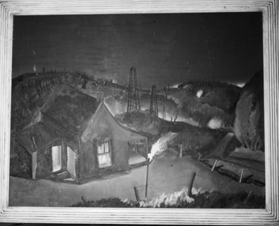 The oil field flares and the yellow lamplight are the only bright spots in this oil painting by Doel Reed which is being exhibited in the Collins Gallery along with a representative group of his works which includes a collection of prints for which he is nationally known. Reed is an instructor at Oklahoma A. & M. College at Stillwater. Published in the Fort Worth Star-Telegram morning edition, October 13, 1940.