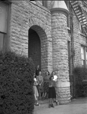 Administration building of Decatur Baptist College. Seen is a close up picture of the school seen with 6 girls standing in the front.