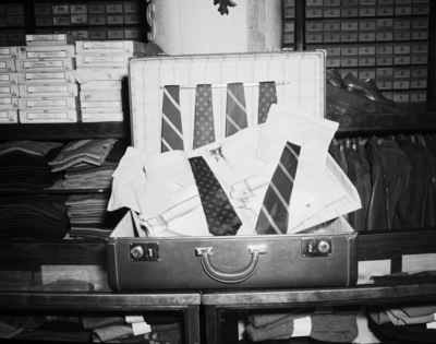 Clothing & dress; Neckties; Handkerchiefs; Suitcases; Luggage; Stores & shops; Clothing industry; Clothing stores