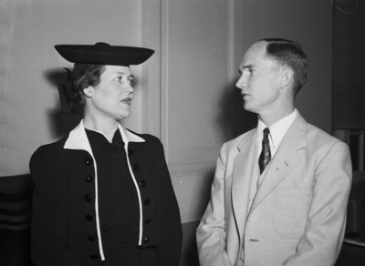 The Probation Institute is holding their conference in Fort Worth, Texas. Attending left to right are Mrs. T. R. Odell and Captain Thomas J. Smith. Mrs. Odell is a teacher at North Texas State Teachers College in Denton, Texas. She is also the juvenile protection chairman of the Texas Congress of Parents and Teachers. She is wearing a hat, blouse, and a coat. Captain Smith, is both a Salvation Army officer and county juvenile and probation officer in Pampa, Texas. He is wearing a light colored three piece suit. They are in a conversation, standing next to each other. Published in the Fort Worth Star-Telegram evening edition, October 11, 1940.