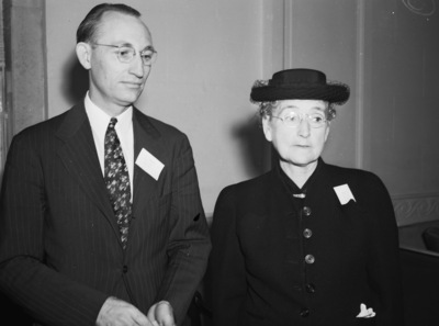 The Probation Institute is holding their conference in Fort Worth, Texas. Attending left to right are W. E. Robertson and Mrs. Estelle Claiborne. Mr. Robertson is a chief probation officer in Houston, Texas. He is also chairman of the legislation committee of the Texas Probation Association. He is wearing a pinstripe suit. Mrs. Claiborne is the chief probation officer at Beaumont, Texas. She is wearing a hat and a coat. They are standing next to each other in this half length photograph. Published in the Fort Worth Star-Telegram evening edition, October 11, 1940.