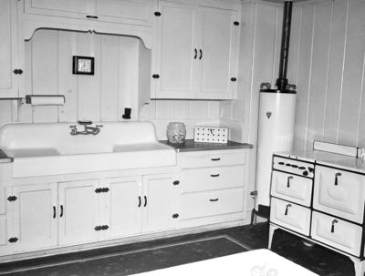 Image shows the interior of Mrs. F. L. Motheral family's home on their 80-acre farm near Rendon, Texas. A sink and a water heater is shown in front of cabinets. Published in the Fort Worth Star-Telegram evening edition, January 29, 1940.