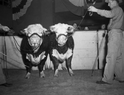 Champion Pair of Hereford Yearlings -- A pair of Hereford yearlings won the championship award in that class at the State Fair of Texas last week. They were winners over a large class and added to the many honors won by their breeder and owner, the Turner Ranch of Sulphur, Oklahoma. The Hereford yearlings of this Livestock Show are pictured here. Two men are standing on either side of the animals, holding their lead ropes. Published in The Fort Worth Star-Telegram morning edition, October 15, 1940.