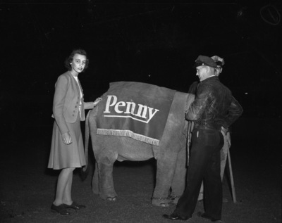 The new baby elephant at Forest Park Zoo, known to many as "Cutie Pie," was given her permanent name, "Penny." Penny is shown in her christening robe, and a red blanket with her name stitched along the side. Sarah Ann Hyde is standing at the left, behind Penny. Sarah is wearing a blazer and a skirt. Two zookeepers are standing at the right.
