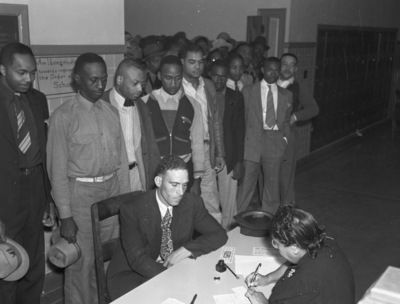 A scene at the James E. Guinn Junior High School as African American eligibles for conscription lined up Wednesday morning to sign for military service. Alberta Majors Ward, one of the registrars, is shown filling out the card of John Estes Sharp, 31, of 1326 St. Louis Avenue, a WPA (Works Progress Administration) worker and father of six children. Waiting his turn in line behind the chair is Antonio Maceo Dodd, 35, another WPA worker. A part of the throng of African American men waiting to register can be seen in the background. . Other in line are Johnnie Booker, Jesse Bogan, Roosevelt Jackson, Willie Junior Washington, Eugene Parks, L. C. Hooper, Allen Clinton Wicks, Louis Walton Morris, R. L. Beavers, and Homer Goins. Published Fort Worth Star-Telegram Evening Edition October 17, 1940.
