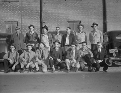 These muleteers, who will care for a boatload of the Texas animals from New Orleans, Louisiana, to Turkey, are shown preparatory to leaving Fort Worth, Texas. Front row, left to right: C. E. Smith, Clarence Lewis, L. L. Hooker, C. A. Ward, Halbert Teague, P. D. Brodie and C. C. Pyle. Back row, left to right: C. W. Gibson, R. A. Nichols, B. M. Bennett, Joe H. Love, N. W. Bast, J. W. Wellmaker and R. H. Smith. The front row is squatting and the back row is standing. Some men have three-piece suits, while others have cardigan sweaters and jackets on. Most men have on a fedora hat. Behind them is a brick building and a row of cars.