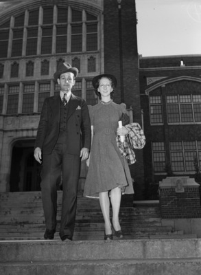 Tarrant County, Texas is conducting their peace time registration of youths for the draft. Standing on the front steps of Paschal High School are Mr. and Mrs. W. D. Gamble. Mrs. Gamble accompanied her husband when he registered. Mr. Gamble is a credit manager for an electrical appliance company. He is dressed in a hat and a three piece suit. Mrs. Gamble is wearing a hat, dress, and necklace. Published Fort Worth Star-Telegram Morning Edition October 17, 1940.