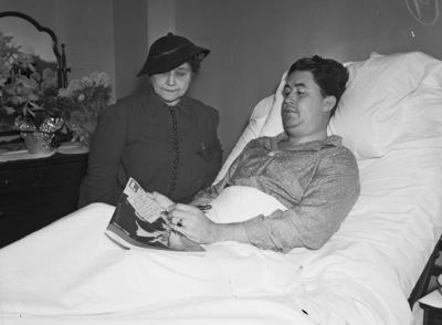 Tarrant County, Texas is conducting their peace time registration for the draft. Dozens of patients at Fort Worth, Texas hospitals are being registered by volunteers. Mrs. Bertie Lee Kelly is shown signing up Lowell Bodiford. Mrs. Kelly is a registered nurse. She is wearing a hat and a button-up dress. Mr. Bodiford is the manager of the Parkway Theater. He is in Harris Memorial Hospital nursing a broken jaw he sustained a few days earlier when he quelled a disturbance near the theater. He is laying in a hospital bed, signing his registration card on a Life magazine. Published Fort Worth Star-Telegram Morning Edition October 17, 1940.