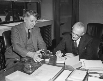 The first delivery of merchant tickets to the Southwestern Exposition and Fat Stock Show is being completed Wednesday. John M. Hendrix is delivering 1,000 tickets to M. A. Fuller, right. Mr. Hendrix is wearing a three piece suit. Mr. Fuller is president of First National Bank. He is dressed in a three piece pinstripe suit.