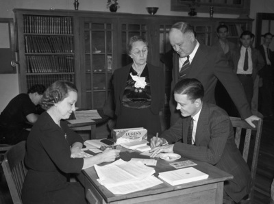 Tarrant County, Texas is conducting their peace time registration for the draft. Three generations of one family are proving their willingness to do their bit for their country during peacetime or in war. A. S. Whitley Junior, twenty-seven, is shown sitting and registering for the draft. Taking the registration is his mother, Mrs. A. S. Whitley Senior. At young Whitley's side is his father. A. S. Whitley Senior and his grandmother, Mrs. M. E. McCorstin. A. S. Junior is the first in his precinct to register. He is dressed in a pinstripe suit. Mrs. Whitley is the chief registrar in Precinct 107. She is dressed in a blouse, brooch, and skirt. Mr. Whitley signed up for Uncle Sam in World War I, twenty-three years earlier. He is dressed in a suit. Mrs. McCorstin, seventy-seven, is a proud witness of the proceedings. Three of her sons fought in World War I. She is wearing a blouse with lace down the front, blazer, and a skirt. There is a long bookcase and a crowd of people in the background. Published Fort Worth Star-Telegram Evening Edition October 18, 1940.
