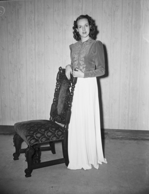 These Texas Wesleyan College students model the latest fashion trends for the college campus in a show sponsored by Washer Brothers, 7:30 pm on October 21 at the college. Model Miss Virginia Hale, Fort Worth, Texas sophomore, makes a hit with the stageline in a white draped jersey evening dress and red velveteen jacket with Persian embroidery. She is standing and holding on to the back of a chair. Published in the Fort Worth Star-Telegram morning edition, October 20, 1940.