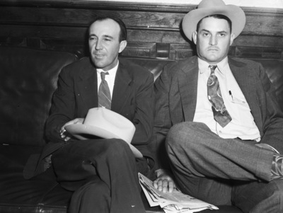 College Station was jammed with supporters of Texas Christian University (TCU) and Texas Agricultural and Mechanical (A&M) College. Left to right, David Schmidt of Harper, Texas, and Gene Cowden, Kerrville, Texas. The men are sitting on a couch and are both wearing suits and ties. Mr. Cowden is wearing a cowboy hat while Mr. Schmidt is holding one in his lap. Star-Telegram Morning, October 21 1940.