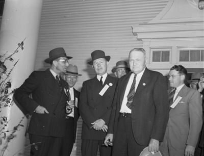 Friends and admirers of Sam Rayburn, former Speaker of the Texas House of Representatives, crowded around him at the homecoming celebration held in Bonham, Texas. In attendance were, left to right, I. E. Glass, Joe H. Smith, Reverend W. Harrison Baker and Marvin F. Love, all of Greenville, Texas; S. H. Pattie, of Van Alstyne, Texas; and John W. Dameron, of Greenville, Texas. The group of men are standing outside of a house, all wearing suits.
