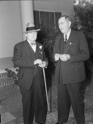 Friends and admirers of Sam Rayburn, former Speaker of the Texas House of Representatives, crowded around him at the homecoming celebration held in Bonham, Texas. In attendance were, left to right, Murrell Buckner, chairman of the Dallas County Democratic executive committee, and Hardy Eubanks, a banker from McKinney, Texas. The two men are standing outside of a house, wearing suits. Mr. Buckner is holding a cane and is wearing a hat.