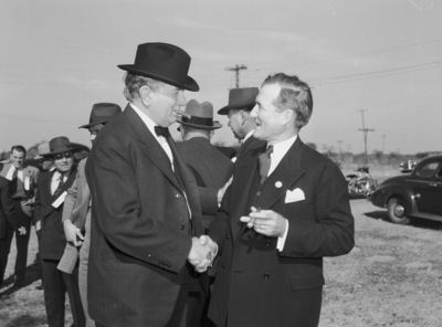 Rayburn homecoming celebration. Left to right, Senator Connally and Myron G. Blalock of Marshall, Texas. They both wears suit and shake hands. Published on October 23, 1940.