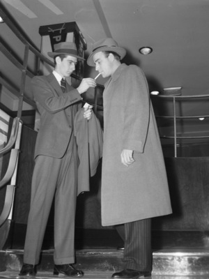 Two men are in a Fort Worth, Texas store, modeling clothes for the Winter season. At the left is a single breasted, three-button English drape covert suit. The overcoat is made of venetian covert, which blends with the suit in color and weave. The hat is of the telescope type, blending a green and tan mixture. His shoes are quarter brogue with an old English finish. The man on the right is wearing a double breasted chalk stripe suit. The top coat is of natural camel hair, with the lining fastened by a zipper. His shoes are plain cap toe and the hat is saddle brim in a khaki color. Published in the Fort Worth Star-Telegram evening edition, October 23, 1940.