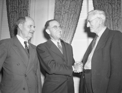These visiting Masons were among the 1,000 who attended the year's last big Masonic fellowship. Shown here is H. C. Salter, of Corpus Christi, Texas (center), Grand Commandery of Texas Knights Templar, greeting J. E. Scott, past commander of the Knights Templar at Cleburne, Texas. The man at the far left is unidentified. All three men are wearing suits. Published in the Fort Worth Star-Telegram evening edition, October 23, 1940.