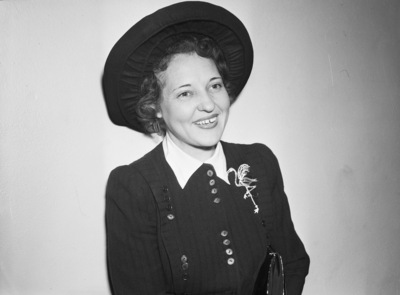 Mrs. Lyle McCaleb, who has returned to her home in Port Aransas, Texas after visiting relatives here this week. She is well dressed and wearing a hat and a flamingo brooch. Published in The Fort Worth Star-Telegram Morning Edition October 26, 1940.