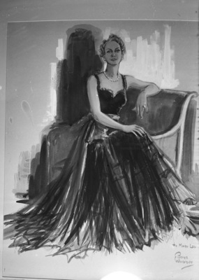Mrs. Bert N. Honea of River Crest as portrayed by Porter Woodruff, New York Artist. Mrs. Honea is decorations chairman for the 1940 Assembly Ball. She is also hostess chairman for the Fort Worth Lecture Foundation. She is depicted wearing a formal ball gown and a pearl necklace as she sits with her legs crossed on a lounge chair.