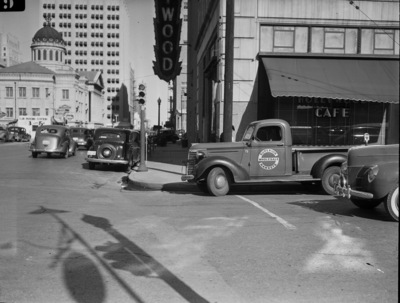 Busy downtown Fort Worth, Texas intersections, demonstrating traffic hazards. Seen are cars parked along a side walk curb or driving on the street.