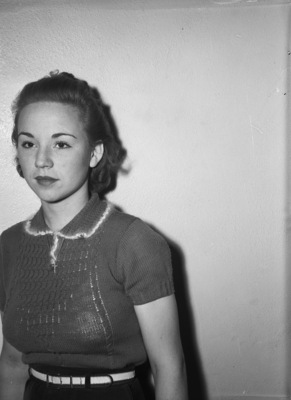Miss Frankie Music, who plays a leading role in "The Family Upstairs," a three-act comedy which the Footlite Club will present at First Methodist Church. She is standing against a bare wall. She is wearing a sweater, skirt, belt, and a cross necklace.