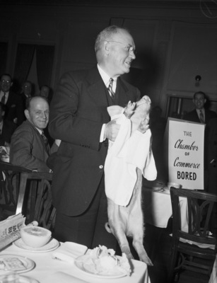 They know their Fort Worth manufactured goods. A quiz session at the annual Fort Worth products luncheon Wednesday brought to light hidden talents and unsuspected lack of knowledge as guests were called upon to identify articles manufactured here. Frank Fillingim, was awarded a squealing pig for his ability to name the packing firm which markets ham under a nationally known trade name. Fillingim is shown dressed in a business suit and holding a pig. Published in The Fort Worth Star-Telegram Morning Edition October 24, 1940.