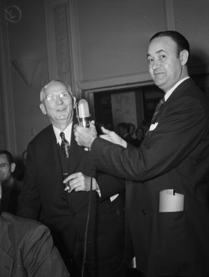 They know their Fort Worth manufactured goods. A quiz session at the annual Fort Worth products luncheon Wednesday brought to light hidden talents and unsuspected lack of knowledge as guests were called upon to identify articles manufactured here. President Edward Waits, left, of T.C.U. can still face his student body without chagrin, after passing his examination with flying colors. When approached with a portable microphone by Ivan Woods, right, President Waits promptly identified a printing machine from an oral description. Published in The Fort Worth Star-Telegram Morning Edition October 24, 1940.