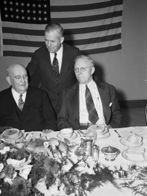 J. L. Lancaster of Dallas, left, who was hailed Thursday night as the best friend of the Union Gospel Mission at the annual banquet here. Center is J. F. Green, mission superintendent, and at right is W.D. Smith, toastmaster. All men are dressed in business suits. Mr. Green is standing and the Mr. Lancaster and Mr. Smith are seated. Published in The Fort Worth Star-Telegram Morning Edition October 24, 1940.