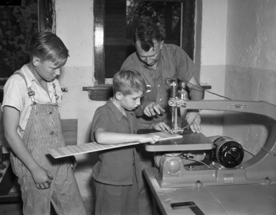 Instructing boys in shop work is one of the seven major activities of the Panther Boys Club. Pictured left to right is Marvin Williams, Joe Barker, and Henry Bentley. Nine year old Joe is receiving advice from Mr. Bentley, the shop instructor, on how to operator a scroll saw. Marvin is looking on. He is wearing a collared shirt and striped overalls. Joe is dressed in a collared shirt and trousers. Mr. Bentley is wearing a short sleeve button-up shirt.