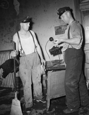 An early Saturday morning fire broke out at the Tarrant County Courthouse. The damage was confined to the Seventeenth District Court office and the Court Reporters office. After the blaze was extinguished, Fireman H. B. Heath, left and fireman B. H. Smith cleaned up the judge's office. Mr. Heath is leaning on a broom, wearing a peaked hat, t-shirt, suspenders trousers, and boots. Mr. Smith is holding a melted telephone. He is dressed in a peaked hat, button-up shirt with cuffed sleeves, suspenders, and trousers.