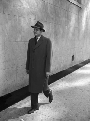 Man modeling woolen topcoat. Medium weight popular in Texas. This 1940 model woolen topcoat of natural color covert is particularly appropriate for Texas weather because of its medium weight. The hat is the new "slant" model in khaki color. The model is pictured here. A man is strolling down a street, in front of a building. Published in The Fort Worth Star-Telegram evening edition, November 14, 1940.