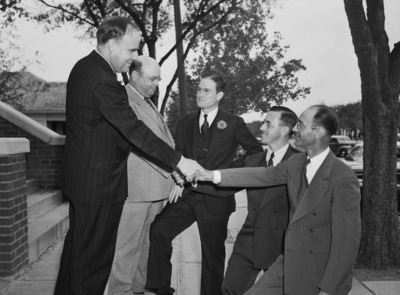 Two North Side Kiwanians and three members of Oak Cliff Club are pictured here. They are, from left to right. Everett Cline, president, and George W. Scaling, chairman of the day, both of the North Side Kiwanis Club; Millard Heath, vice president-elect; Floyd Gish, inter-club relations chairman, and W. C. Alexander, president-elect, of the Oak Cliff Club. North Side is greeting visitors Oak Cliff Kiwanis Club. All five men are dressed in suits and ties. Published in the Fort Worth Star-Telegram morning edition, October 26, 1940.
