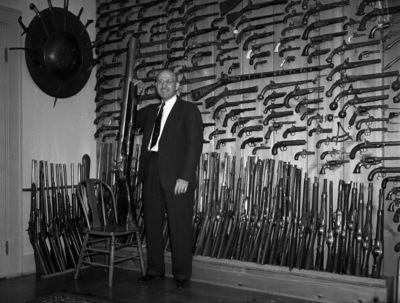 Doctor Samuel Jagoda, shown amid his array of weapons. He collects pistols and guns as a hobby. He started 17 years ago when a patient, who was an antique gun collector, gave him some rare weapons. Since then Dr. Jagoda has been acquiring guns from every country, some date back to 400-year-old Oriental match-lock model. The collection said to be the largest known and contains besides guns, knives, swords, shields, helmets, handcuffs, stirrups, cannon, clubs and most anything related to hostility. Here you see he is standing and smile next to part of his display collection. Published in Fort Worth Star-Telegram morning edition, November 24, 1940.